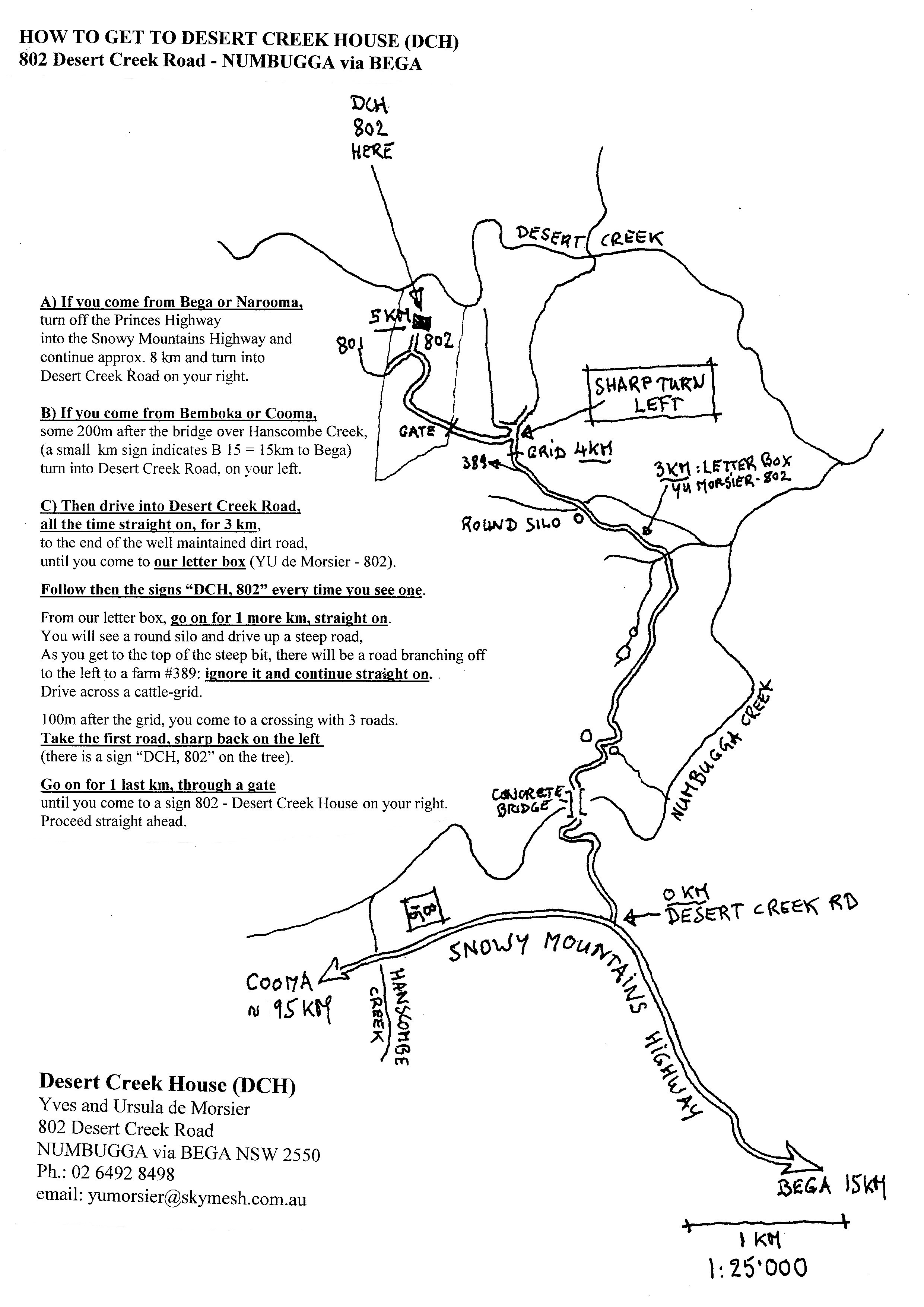 watch for the tiny km sign "B 15" (it means Bega is 15km away) on your left, immediately after the bridge over Hanscombe Creek. Then turn soon after, into Desert Creek Road, on your left. ***