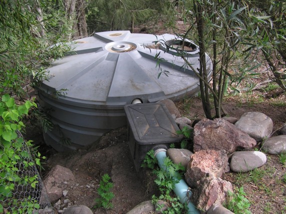 GREY WATER SYSTEM: a tank filled with sand filters our grey water which is then reused for watering the garden