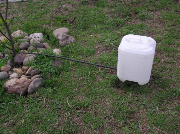 OUR WHITE ELEPHANTS: 20 liter containers are connected to a polypipe which allows water to drip slowly into the ground